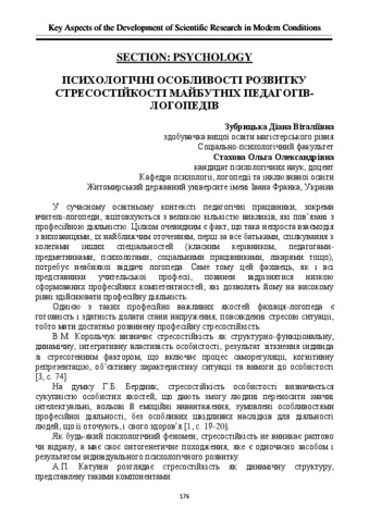 Зубрицька Д. В., Стахова О. О. (2024) Психологічні особливості розвитку стресостійкості майбутніх педагогів-логопедів. In: XLV Міжнародна науково-практична конференція «Key Aspects of the Development of Scientific Research in Modern Conditions», 30 жовтня – 1 листопада 2024 р., Констанца, Румунія. С. 176–179.
