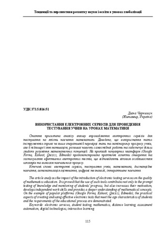 Чернишук Д. І. (2025) Використання електронних сервісів для проведення тестування учнів на уроках математики. In: Міжнародна науково-практична інтернет-конференція «Тенденції та перспективи розвитку науки і освіти в умовах глобалізації», 30 квітня 2025 р., Переяслав. С. 115–120.