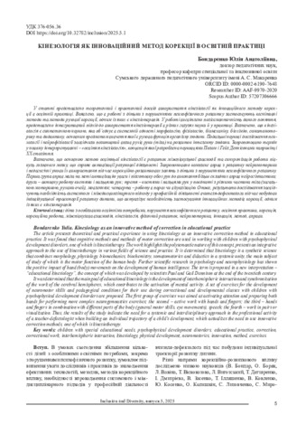 У статті представлено теоретичний і практичний досвід використання кінезіології як інноваційного методу корекції в освітній практиці. Виявлено, що в роботі з дітьми з порушеннями психофізичного розвитку застосовують когнітивні методи та методи рухової корекції, одним із яких є кінезіотерапія. У роботі висвітлено полісемантичність даного поняття, представлено інтегративний підхід до використання кінезіотерапії в різних галузях науки й у практиці. Визначено, що кінезіологія є синтетичною наукою, яка об’єднує в системній єдності морфологію, фізіологію, біомеханіку, біохімію, соматомоторику та дидактику, основним предметом вивчення якої є рухова функція організму людини. Подальші наукові дослідження психології і нейрофізіології засвідчили позитивний вплив рухів руки (тіла) на розвиток інтелекту людини. Запропоновано термін у новому інтерпретуванні – «освітня кінезіологія», концепція якої розроблена науковцями Полом і Гейл Деннісонами наприкінці ХХ століття. Визначено, що основною метою освітньої кінезіології є розвиток міжпівкульної взаємодії та синхронізація роботи півкуль головного мозку, що сприяє активізації розумової діяльності. Запропоновано комплекс вправ з розвитку нейромоторики і педагогічні умови їх використання під час корекційно-розвиткових занять з дітьми з порушеннями психофізичного розвитку. Перша група вправ мала на меті активізацію уваги і підготовку обох рук до виконання більш складних вправ нейрогімнастики; друга – активну роботу кистями і пальцями рук; третя – кистями і пальцями рук у поєднанні з різними частина тіла (загальною моторикою, рухами очей), мовленням; четверта – роботу в парах чи візуалізацію. Отже, результати дослідження засвідчують необхідність системного і міждисциплінарного підходу у професійній діяльності вчителя-дефектолога під час побудови індивідуальної траєкторії розвитку дитини, що актуалізує необхідність застосування інноваційних методів корекції, одним із яких є кінезотерапія.