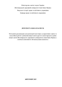 У методичних рекомендаціях для організації підготовки до практичних занять та самостійної роботи з освітньої компоненти «Інтелектуальна власність», складеної для підготовки здобувачів вищої освіти другого (магістерського) рівня вищої освіти Житомирського державного університету імені Івана Франка, вказано мету та завдання компоненти. Методична розробка містить навчальний план, плани практичних занять, завдання для самостійної роботи, контрольні питання, юридичні ситуації, тестові завдання, список рекомендованої літератури.
