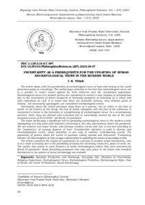 Вітюк І. К.ORCID: https://orcid.org/0000-0002-2998-6323 (2020) Uncertainty as a Prerequisite for the Updating of Human Eschatological Views in the Modern World. Вісник Житомирського державного університету імені Івана Франка. Філософські науки. № 87. С. 26–37. ISSN 2663-7650. DOI: 10.35433/PhilosophicalSciences.1(87).2020.26-37.