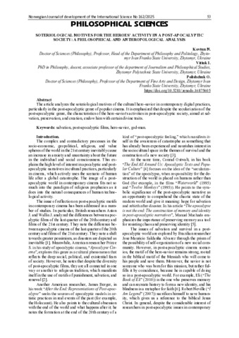 Ковтун Н. М.ORCID: https://orcid.org/0000-0002-5529-8655, Вітюк І. К.ORCID: https://orcid.org/0000-0002-2998-6323, Поліщук О. П.ORCID: https://orcid.org/0000-0002-1095-8031 (2025) Soteriological Motives for the Heroes' Activity in a Post-Apocalyptic Society: A Philosophical and Anthropological Analysis. Norwegian Journal of development of the International Science. № 162. С. 53–57. ISSN 3453-9875. DOI: 10.5281/zenodo.16875605.