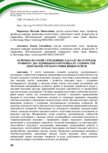 Освітньо-наукове середовище закладу як осередок розвитку дослідницького потенціалу і здібностей здобувачів третього рівня вищої освіти.