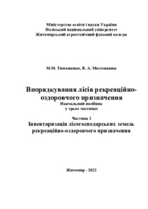 Тимошенко М. М.ORCID: https://orcid.org/0009-0003-5056-8200, Мостепанюк В. А.ORCID: https://orcid.org/0000-0001-5129-2398 (2022) Впорядкування лісів рекреаційно-оздоровчого призначення: навчальний посібник у трьох частинах. Частина 2. Інвентаризація лісогосподарських земель рекреаційно-оздоровчого призначення. 186 с. [Навчальний матеріал]