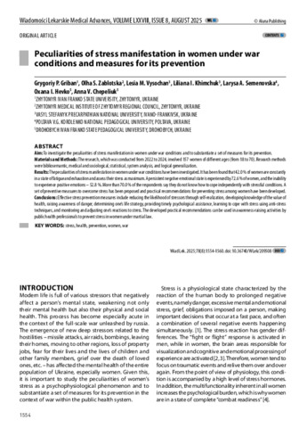 Грибан Г. П.ORCID: https://orcid.org/0000-0002-9049-1485, Заблоцька О. С.ORCID: https://orcid.org/0000-0002-0850-5754, Висоцька Л. М.ORCID: https://orcid.org/0000-0002-8978-5005, Хімчук Л. І.ORCID: https://orcid.org/0000-0002-9243-3131, Семеновська Л. А.ORCID: https://orcid.org/0000-0001-9881-7307, Гевко О. І.ORCID: https://orcid.org/0000-0002-9051-6021, Чепелюк А. В.ORCID: https://orcid.org/0000-0001-7447-8478 (2025) Peculiarities of stress manifestation in women under war conditions and measures for its prevention. Wiadomości Lekarskie Medical Advances. № 8. С. 1554–1560. ISSN 0043-5147. DOI: 10.36740/WLek/209508.