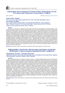 Мета дослідження полягає у визначенні основних аспектів і напрямів інформаційно-аналітичного забезпечення державних механізмів запобігання та врегулювання міжнаціональних конфліктів. Окреслено наукові підходи до проблеми прогнозування міжнаціональних конфліктів на основі аналітики та інформаційних даних. Обґрунтовано історичні основи розвитку державної політики управління суспільними процесами, пошуку і застосування ефективних методів запобігання кризам та конфліктам такого характеру. Доведено, що ефективність функціонування державних механізмів запобігання та врегулювання міжнаціональних конфліктів безпосередньо залежить від сукупності взаємодіючих інформаційних підсистем, розроблених єдиних підходів і методології прийняття управлінських рішень з досліджуваних питань. Встановлено, що система інформаційного та аналітичного забезпечення повинна враховувати неоднорідність процесу прийняття управлінських рішень та специфіку роботи посадових осіб на різних етапах їх прийняття. У зв’язку із цим запропоновано низку взаємодіючих підсистем з відповідними функціями та характеристиками, як-то: “інформаційно-комунікаційне середовище”, “моніторинг проблемних ситуацій”, “інформаційно-документальне обслуговування”, “ситуаційний і системний аналіз”, “підтримка процесів підготовки та прийняття управлінських рішень”, “забезпечення необхідного рівня кінцевих показників діяльності”. Доведено, що запобігання виникненню міжнаціональних конфліктів, а в ідеалі – усунення ймовірних негативних явищ на етнонаціональному ґрунті є одним з нагальних державотворчих завдань. Його вирішення вимагає копіткого вивчення та аналізу етнонаціональної ситуації в регіонах, теоретичного обґрунтування дій органів державної влади у цій сфері, вироблення концептуальних підходів, інформаційно-аналітичного супроводу прийняття державно-управлінських рішень, інноваційних технологій регулятивного впливу держави на процеси етноконфліктного характеру.