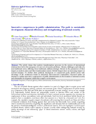 The article claims that modern transformation processes in the system of international relations have led to the emergence of a new set of security problems threats, challenges, and risks of a non-traditional series, differing from traditional, military-strategic threats in the parameters of their impact on modern states and their transboundary nature. Hybrid dangers have an increasing impact on societal domains. To further their political, ideological, or commercial goals, hybrid actors take advantage of the weaknesses found in intricately interconnected communities. Research makes an attempt to outline innovative competencies of public administration in the domains of national security and sustainable development within this complex environment.