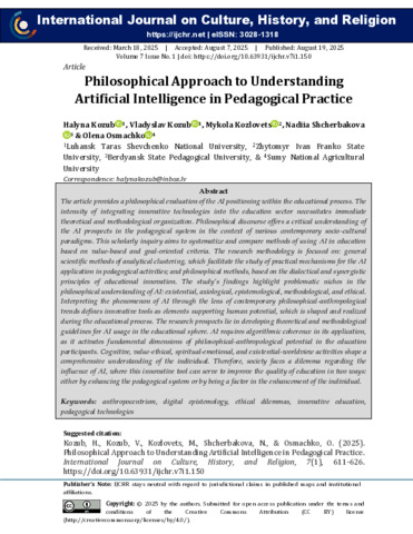 ДСТУ 8302:2015: | Philosophical Approach to Understanding Artificial Intelligence in Pedagogical Practice / Г. О. Козуб та ін. International Journal on Culture, History, and Religion. 2025. Т. 7, № SI1. С. 611–626. DOI: 10.63931/ijchr.v7iSI1.150. |