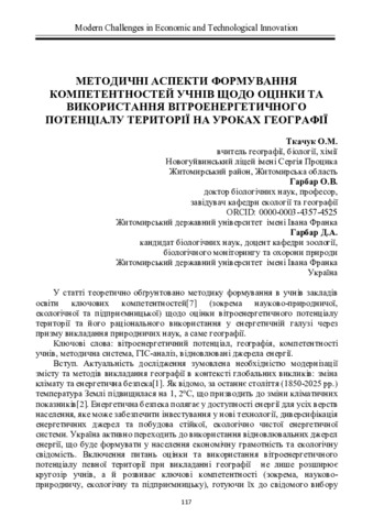 Ткачук О. М., Гарбар О. В.ORCID: https://orcid.org/0000-0003-4357-4525, Гарбар Д. А.ORCID: https://orcid.org/0000-0001-5739-3114 (2025) Методичні аспекти формування компетентностей учнів щодо оцінки та використання вітроенергетичного потенціалу території на уроках географії. In: 1 Міжнародна науково-практична конференція «Modern Challenges in Economic and Technological Innovation», 15-17 жовтня 2025 р., Болонья, Італія. С. 117–119. DOI: 10.70286/isu-15.10.2025.