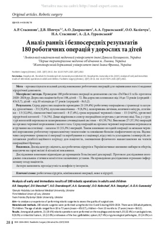 Аналіз ранніх і безпосередніх результатів 180 роботичних операцій у дорослих та дітей.