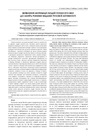 Рухова активність має дуже важливий вплив на самопочуття та здоров’я людей похилого віку. Регулярні заняття фізичними Вправами покращують якість життя, зменшують ризик виникнення різних хвороб та уповільнюють процеси старіння. Стаття присвячена мотивації осіб похилого віку до занять руховою активністю. Мета дослідження – визначити мотивацію до занять різними видами рухової активності людей похилого віку України та Польщі. Методи. У досліджені використано теоретичний аналіз науково методичної літератури, педагогічні, соціологічні методи дослідження та методи математичної статистики. Дослідження проводилися на базі Інституту спорту і фізичної культури Університету економіки в Бидгощі (Польща) та Харківської державної академії фізичної культури (Україна). В експерименті брали участь 120 (по 30 чоловіків і жінок з України та Польщі) осіб похилого віку (середній вік склав 66.12 ± 2.98 років). Результати. В результаті аналізу анкетування людей похилого віку з’ясовано переваги у виборі різних видів рухової активності чоловіків та жінок, які мешкають у Польщі та Україні. В ході вивчення мотивації до занять руховою активністю людей похилого віку виявлено, що основними мотивами є поліпшення стану здоров’я, спілкування з друзями та підтримання фізичної форми. Висно вки. Встановлено, що в Польщі найпоширенішими видами рухової активності серед людей похилого віку є плавання, скандинавська ходьба, оздоровчий туризм та їзда на велосипеді; в Україні перевагу надають тим самим видам рухової діяльності окрім їзди на велосипеді, що пов’язано з недостатньо розвинутою інфраструктурою та технічним забезпеченням в Україні. Визначено мотиви занять фізичною активністю людей похилого віку. Так, пріоритетними виявились оздоровчо-рекреаційні, комунікативні та профілактичні.