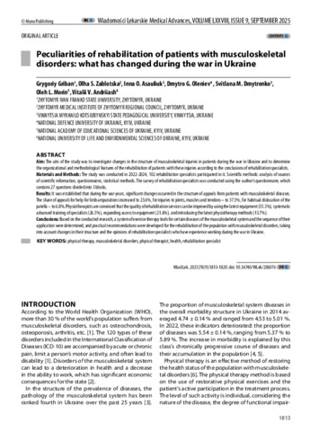 Грибан Г. П.ORCID: https://orcid.org/0000-0002-9049-1485, Заблоцька О. С.ORCID: https://orcid.org/0000-0002-0850-5754, Асаулюк І. О.ORCID: https://orcid.org/0000-0001-8119-2726, Оленєв Д. Г.ORCID: https://orcid.org/0000-0001-9685-725X, Дмитренко С. М.ORCID: https://orcid.org/0000-0001-5934-4893, Морін О. Л.ORCID: https://orcid.org/0000-0001-5756-8359, Андріяш В. В.ORCID: https://orcid.org/0000-0002-8271-6453 (2025) Peculiarities of rehabilitation of patients with musculoskeletal disorders: what has changed during the war in Ukraine. Wiadomości Lekarskie Medical Advances. Т. 78, № 9. С. 1813–1820. ISSN 0043-5147. DOI: 10.36740/WLek/206076.