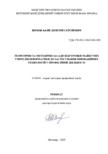 Вербівський Д. С.ORCID: https://orcid.org/0000-0002-5238-1189 (2025) Теоретичні та методичні засади підготовки майбутніх учителів інформатики до застосування інноваційних технологій у професійній діяльності. Автореферат Докторський thesis, Житомирський державний університет імені Івана Франка.