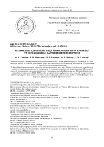 Метою статті є виявлення експансивних адвентивних видів урбанофлори м. Кременця та його околиць, аналіз їх способів поширення, рівня натуралізації та створення картосхем їх поширення в межах досліджуваної території.У дослідженні використано теоретичні та практичні методи. Теоретичні методи передбачали аналіз літературних джерел із подальшою їх систематизацією та узагальненням. Практичні методи стосувалися польових досліджень і камерального оброблення даних. Польові дослідження проводилися протягом 2010–2024 років, у періоди вегетації рослин, як основний використовувався маршрутно-діагностичний метод. Класифікація адвентивних видів за класифікацією Яна Корнася, вдосконаленою В.В. Протопоповою. У результаті встановлено, що в урбанофлорі Кременця налічується понад 20 експансивних адвентивних видів, серед яких переважають кенофіти північноамериканського походження.Найактивніше поширюються Solidago canadensis L., Ambrosia artemisiifolia L., Heracleumsosnowskyi Manden., Heracleum mantegazzianum S. et L., Reynoutria sachalinensis (Fr. Schmidt) Naka i, Phalacroloma annuum (L.) Dumort), Cyclachaena xanthiifolia (Nutt.) Fresen.). Проведено їх типологізацію за шляхами поширення (анемохорні, антропохорні, барохорні тощо), ступенем натуралізації (епекофіти, агріофіти, ергазіофіти) та екологічною небезпекою. Наукова новизна полягає в уточненні складу експансивної частини урбанофлори Кременця, доповненні регіональних флористичних зведень, вперше створених картосхемах поширення ключових інвазійних видів на локальному рівні.Практична значущість дослідження полягає у формуванні науково обґрунтованої основи для флористичного моніторингу, виявлення фітонебезпечних територій, а також для розроблення природоохоронних заходів щодо обмеження поширення небажаних чужорідних видів у межах урбоекосистем.