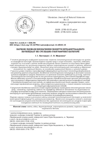 У статті розглянуто особливості визначення поняття «інтелектуальний потенціал» як суспільно-географічної категорії. Проаналізовано наукові праці в галузі економіки, соціології, педагогіки, соціології та психології з метою всебічного розуміння даного поняття як важливого ідентифікатора економічного та суспільного розвитку окремих територіальних громад чи районів, областей в умовах децентралізації та війни. Визначено місце інтелектуального потенціалу у збереженні економічної та соціальної безпеки, як складників національної безпеки в сучасних умовах.У сучасних умовах стрімких трансформацій інформаційного суспільства й інтелектуалізації регіонального розвитку зростає актуальність дослідження інтелектуального потенціалу як важливого чинника суспільно-географічних процесів. Незважаючи на зростання кількості публікацій на цю тему, поняття інтелектуального потенціалу досі не має усталеного трактування у вітчизняній географічній науці.Метою підготовки статті є систематизація наукових підходів до визначення сутності інтелектуального потенціалу й обґрунтування доцільності його розгляду як окремої суспільно-географічної категорії.У дослідженні використано такі методи, як порівняльно-аналітичний аналіз наукових джерел, систематизація термінологічного апарату, логіко-теоретичне узагальнення, а також елементи системного та структурно-функціонального підходів.У результаті дослідження визначено основні наукові парадигми трактування інтелектуального потенціалу – економічну, соціологічну, освітню та географічну; здійснено їх зіставлення та акцентовано на специфіці просторового виміру цього поняття. Запропоновано авторське визначення інтелектуального потенціалу як просторово організованого комплексу людських ресурсів із високим рівнем освіченості, знаннєвої активності та здатності до інноваційного розвитку.Наукова новизна полягає в уточненні змісту категорії «інтелектуальний потенціал» у контексті просторової диференціації та регіонального розвитку. Практична значущість полягає в можливості застосування результатів дослідження для оцінювання інтелектуальних ресурсів територій, планування освітньої та інноваційної політики на регіональному рівні.