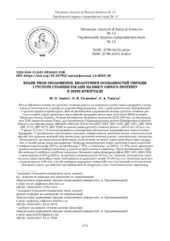 Вплив гібридного складу та густоти стояння рослин на показники якості зерна кукурудзи є актуальним питанням як з огляду на наукове обґрунтування, так і щодо практичного впровадження в сучасне аграрне виробництво. Метою дослідження є оцінювання впливу густоти стояння рослин на вміст сирого протеїну в зерні гібридів кукурудзи різних груп стиглості (ФАО) в умовах Північного Степу України. Польові дослідження проводили протягом 2022–2024 рр. на дослідному полі ТОВ «Агротехнологія-Плюс», що знаходиться в Кропивницькому районі Кіровоградської області.Вивчали сім гібридів марки DEKALB з ФАО від 310 до 420 (ДКС 4098, ДКС 4109, ДКС 4391, ДКС 4598, ДКС 4712, ДКС 5075, ДКС 5206) за восьми рівнів густоти стояння рослин – від 55 до 110 тис./га.У фазах 3–5 та 7–9 листків проводили позакореневі підживлення мікродобривом Аміно Ультра Кукурудза. У дослідженнях застосовано польовий, лабораторний, математичний і статистичний методи для оцінення взаємодії між генотипом, густотою стояння рослин і екологічними чинниками.Встановлено, що вирішальним фактором, який впливає на вміст сирого протеїну в зерні кукурудзи, є погодні умови року вирощування. Найвищу концентрацію сирого протеїну в зерні визначено в помірно посушливому 2023 р. (у середньому 7,75%), а найнижчу – у 2024 р. (7,16%), який характеризувався гострим дефіцитом вологи у критичні фази росту й розвитку. Серед досліджуваних гібридів найвищі й найбільш стабільні показники білковості зерна формував гібрид ДКС 4391 (ФАО 350), з максимумом 8,45% у 2023 р. за густоти стояння рослин 80 тис./га. Загалом, оптимальне накопичення сирого протеїну в зерні спостерігали за щільності посівів 75–80 тис./га. Зниження густоти стояння рослин (≤60 тис./га) або надмірне загущення посівів (≥90 тис./га) призводило до зниження білковості зерна, що свідчить про обмеження як ресурсного, так і алелопатичного характеру. Отримані результати підтверджують суттєвий вплив генотипу та густоти стояння рослин на якість зерна кукурудзи, особливо за контрастних гідротермічних умов. Одержані дані можуть бути використані для оптимізації технологій вирощування кукурудзи з метою стабілізації показників якості зерна в умовах кліматичних змін та економічної нестабільності.