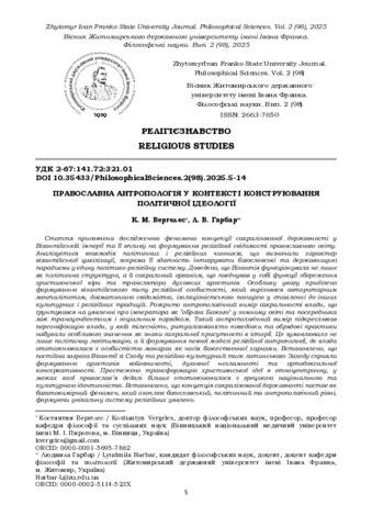| ДСТУ 8302:2015: | Вергелес К. М., Гарбар Л. В. Православна антропологія у контексті конструювання політичної ідеології. Вісник Житомирського державного університету імені Івана Франка. Філософські науки. 2025. № 98. С. 5–14. DOI: 10.35433/PhilosophicalSciences.2(98).2025.5-14. |