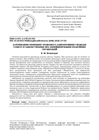 | ДСТУ 8302:2015: | Нечипорук В. М. Дотримання принципу правового забезпечення свободи совісті в законі України про перейменування релігійних організацій. Вісник Житомирського державного університету імені Івана Франка. Філософські науки. 2025. № 98. С. 37–50. DOI: 10.35433/PhilosophicalSciences.2(98).2025.37-50. |