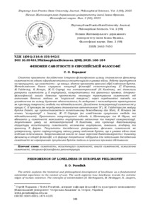 Порадюк С. О.ORCID: https://orcid.org/0009-0002-1474-613X (2025) Феномен самотності в європейській філософії. Вісник Житомирського державного університету імені Івана Франка. Філософські науки. № 98. С. 166–184. ISSN 2663-7650. DOI: 10.35433/PhilosophicalSciences.2(98).2025.166-184.