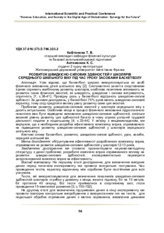 Кафтанова Т. В.ORCID: https://orcid.org/0000-0002-2529-3917, Антимонюк К. С. (2025) Розвиток швидкісно-силових здібностей у школярів середнього шкільного віку під час уроку засобами баскетболу. In: International Scientific and Practical Conference “Science, Education, and Society in the Digital Age of Globalization: Synergy for the Future”, October 25, 2025, Seattle, USA. С. 56–57.