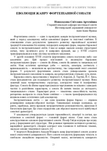Новосадова С. А.ORCID: https://orcid.org/0000-0003-2937-8958 (2025) Еволюція жанру фортепіанної сонати. In: X Міжнародна науково-практична конференція «Latest technologies and youth: the development of scientific trends», 3–5 листопада 2025 р., Прага, Чехія. С. 23–28.