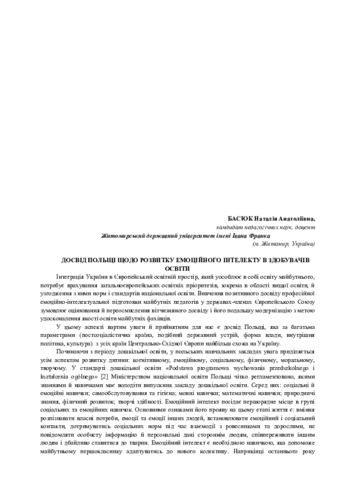 Басюк Н. А.ORCID: https://orcid.org/0009-0009-5007-276X (2025) Досвід Польщі щодо розвитку емоційного інтелекту в здобувачів освіти. In: Х Всеукраїнська науково-практична конференція з міжнародною «Актуальні проблеми підготовки педагогічних та науково-педагогічних працівників у сучасній системі освіти України», 29–30 жовтня 2025 р., Умань. С. 21–22.