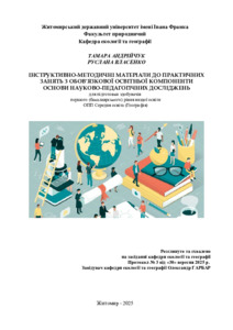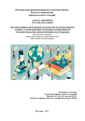 Андрійчук Т. В.ORCID: https://orcid.org/0000-0001-5402-9528, Власенко Р. П.ORCID: https://orcid.org/0000-0002-3743-4406 (2025) Інструктивно-методичні матеріали до практичних занять обов’язкової освітньої компоненти «Основи науково-педагогічних досліджень» для підготовки здобувачів першого (бакалаврського) рівня вищої освіти ОПП Середня освіта (Географія). 62 с. [Навчальний матеріал]