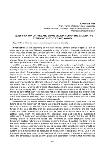 Хом’як І. В.ORCID: https://orcid.org/0000-0003-0080-0019 (2025) Classification of Tree and Shrub Vegetation of the Meliorative System of the Tnya River Valley. In: Міжнародна науково-практична конференція «Актуальні питання екології, ботаніки, бджільництва та економіки збалансованого природокористування», 9–10 вересня 2025 р., Київ. С. 144–147.