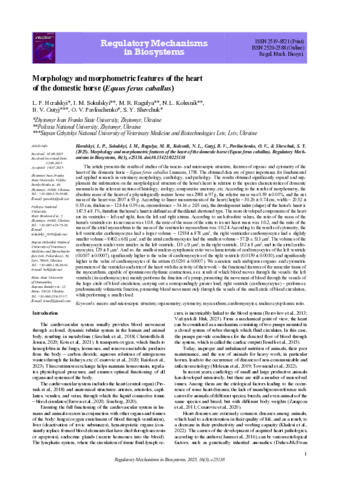 The article presents the results of studies of the macro- and microscopic structure, features of organo- and cytometry of the heart of the domestic hor se – Equus ferus caballus L innaeus , 1758. The obtained data are of great importance for fundamental and applied research in veterinary morphology, cardiology, and pathology. The results obtained significantly expand and su p plement the information on the morphological structure of the horse's heart in relation to the species characteristics of domestic mammals in the relevant sections of histology, zoology, comparative anatomy, etc. According to the results of morphometry, the absolute mass of the heart of a physiologically mature horse wa s 2988 ± 97 g, the relative mass wa s 0.59 ± 0.01%, and the net mass of the heart wa s 2807 ± 93 g. According to linear measurements of the heart (height – 30.26 ± 0.74 cm, width – 20.52 ± 0.55 cm, thickness – 12.84 ± 0.39 cm, circumference – 54.16 ± 2.05 cm), the development index (shape) of the horse’s heart is 147.5 ± 8. 1 %, therefore the horse’s heart is defined as of the dilated-shortened type. The more developed components of the heart are its ventricles – left and right, then the left and right atrium. According to such absolute values, the ratio of the mass of the horse’s ventricles to its net mass wa s 1:0.8, the ratio of the mass of the atria to its net heart mass was 1:0.2, and the ratio of the mass of the atrial myocardium to the mass of the ventricular myocardium wa s 1:0.24. According to the results of cytometry, the left ventricular cardiomyocytes ha d a larger volume – 12554 ± 87 8 μm 3 , the right ventricular cardiomyocytes ha d a slightly smaller volume – 840 2 ± 681 μm 3 , and the atrial cardiomyocytes ha d the smallest volume – 5729 ± 513 μm 3 . The volumes of the cardiomyocyte nuclei we re similar: in the left ventricle, 13 3 ± 9 μm 3 ; in the right ventricle, 132 ± 8 μm 3 ; and in the atrial card i omyocytes, 129 ± 8 μm 3 . And so, the smallest nuclear-cytoplasmic ratio wa s characteristic of cardiomyocytes of the left ventricle (0.0107 ± 0.0007), significantly higher is the value of cardiomyocytes of the right ventricle (0.0159 ± 0.00 10 ), and significantly higher is the value of cardiomyocytes of the atrium (0.0230 ± 0.000 7 ). We associate such ambiguous organo- and cytometric parameters of the ventricles and atria of the heart with the activity of their work – the functional features of the muscular tissue of the myocardium, capable of spontaneous rhythmic contractions, as a result of which blood moves through the vessels: the left ventricle (its cardiomyocytes) mainly performs the function of a pump, promoting the movement of blood through the vessels of the large circle of blood circulation, carrying out a correspondingly greater load; right ventricle (cardiomyocytes) – performs a predominantly volumetric function, promoting blood movement only through the vessels of the small circle of blood circulation, while performing a smaller load.