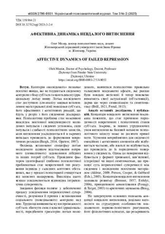 | ДСТУ 8302:2015: | Мазяр О. В. Афективна динаміка невдалого витиснення. Український психоаналітичний журнал. 2025. Т. 3, № 2. С. 1–8. DOI: 10.32782/upj/2025-3-2-4. |