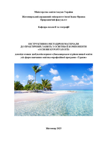 Шестакова А. В.ORCID: https://orcid.org/0000-0003-1388-5824, Нестерчук І. К.ORCID: https://orcid.org/0009-0004-5721-3928 (2025) Інструктивно-методичні матеріали до практичних занять з освітньої компоненти «Основи курортології». 33 с. [Навчальний матеріал]