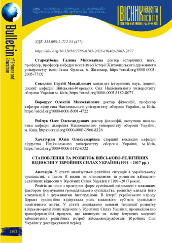 Становлення та розвиток військово-релігійних відносин у збройних силах України (1991 – 2017 рр.).
