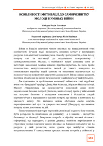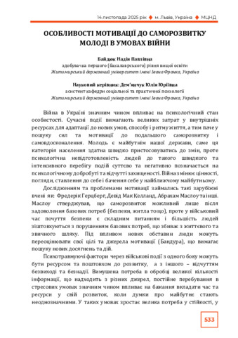 Байдюк Н. П. (2025) Особливості мотивації до саморозвитку молоді в умовах війни. In: X Міжнародна наукова конференція «Науковий простір: актуальні питання, досягнення та інновації», 14 листопада 2025 р., Львів. С. 533–536. DOI: 10.62731/mcnd-14.11.2025.