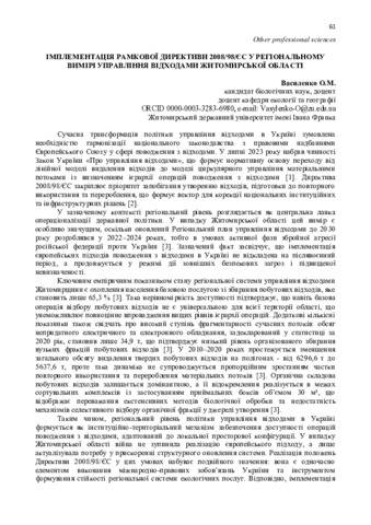 Імплементація рамкової директиви 2008/98/ЄС у регіональному вимірі управління відходами Житомирської області.