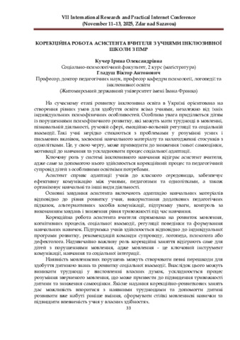 Кучер І. О., Гладуш В. А.ORCID: https://orcid.org/0000-0001-5700-211X (2025) Корекційна робота асистента вчителя з учнями інклюзивної школи з ПМР. In: VII Міжнародна науково-практична Інтернет-конференція «Інноваційні процеси в науці та освіті», 11–13 листопада 2025 р., Ждяр-над-Сазавою, Чехія. С. 33–34.