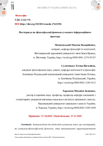 Актуальність дослідження зумовлена тим, що постправда, як соціально-філософський феномен, стає визначальною характеристикою сучасного інформаційного простору. Маніпулятивні практики, емоційне сприйняття та селективність інформації дедалі частіше витісняють раціональні критерії істинності, формуючи нові моделі суспільної комунікації. Це створює виклики для розвитку критичного мислення, збереження демократичних цінностей та забезпечення стабільності соціальних інститутів. Мета дослідження полягає у з’ясуванні сутності феномену постправди як категорії філософського аналізу та у визначенні її впливу на структуру сучасного інформаційного простору. Увагу зосереджено на виявленні ключових особливостей постправди, механізмів її поширення та наслідків для формування суспільних уявлень і практик. Методи. Використано міждисциплінарний підхід, що поєднує методи філософського аналізу, герменевтики, дискурсивного підходу, а також елементи соціально-комунікаційного аналізу. Це дало змогу інтегрувати різні наукові перспективи та здійснити комплексне осмислення явища постправди. Результати. Встановлено, що феномен постправди базується на домінуванні емоційних наративів над фактологічною точністю, що призводить до трансформації природи істини в публічному дискурсі. Виявлено, що ключовими інструментами поширення постправди є мас-медіа та цифрові комунікації, які створюють середовище для маніпуляцій, посилення інформаційних «бульбашок» та фрагментації суспільної свідомості. Показано, що в умовах постправди зростає роль індивідуального критичного мислення та здатності до рефлексії, тоді як суспільні інститути втрачають монополію на формування достовірного знання. Доведено, що постправда не лише спотворює інформаційну картину світу, але й формує нову епістемологічну парадигму, у якій істина набуває відносного та контекстуального характеру. Висновки. Аргументовано, що дослідження постправди як філософського феномену є необхідним для глибшого розуміння механізмів сучасної комунікації та їхнього впливу на суспільний розвиток. Показано, що подолання негативних наслідків постправди можливе завдяки розвитку медіаграмотності, підвищенню ролі критичного мислення та формуванню відповідальної комунікаційної культури. Отримані результати можуть бути використані у подальших наукових дослідженнях, а також у практичних стратегіях інформаційної політики та освітніх програмах.