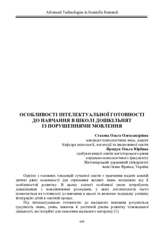 Особливості інтелектуальної готовності до навчання в школі дошкільнят із порушеннями мовлення.