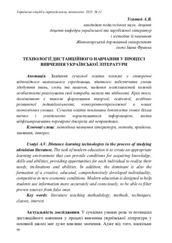 | ДСТУ 8302:2015: | Усатий А. В. Технології дистанційного навчання у процесі вивчення української літератури. Українські студії в європейському контекст. 2025. № 11. С. 90–97. DOI: 10.31110/2710-3730/2025-11. |