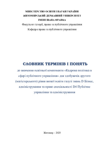 Словник термінів і понять до вивчення освітньої компоненти «Кадрова політика в сфері публічного управління» для здобувачів другого (магістерського) рівня вищої освіти галузі знань D Бізнес, адміністрування та право спеціальності D4 Публічне управління та адміністрування.