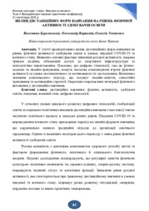 Бурковський В. В., Варивода О. В., Усатенко О. В. (2025) Вплив дистанційних форм навчання на рівень фізичної активності здобувачів освіти. In: V Всеукраїнська науково-практична конференція «Фізична культура і спорт. Виклики сучасності», 21 листопада 2025 р., Харків. С. 47–50.
