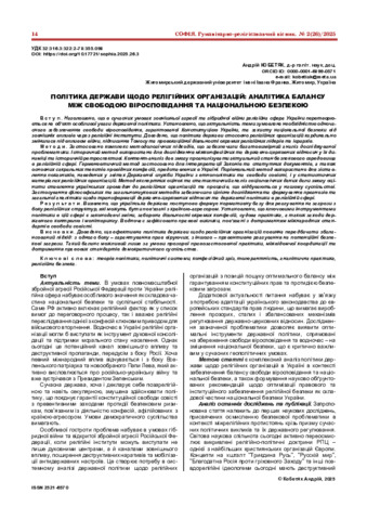 | ДСТУ 8302:2015: | Кобетяк А. Р. Політика держави щодо релігійних організацій: аналітика балансу між свободою віросповідання та національною безпекою. Софія. Гуманітарно-релігієзнавчий вісник. 2025. № 26. С. 14–19. DOI: 10.17721/sophia.2025.26.3. |