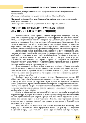 Ігнатченко Д. М. (2025) Розвиток футболу в умовах війни (на прикладі Житомирщини). In: IX Міжнародна студентська наукова конференція «Актуальні питання та перспективи проведення наукових досліджень», 28 листопада 2025 р., Рівне. С. 715–716. DOI: 10.62732/liga-inter-28.11.2025.
