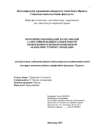 Подано тематику самостійної/індивідуальної роботи обов’язкової освітньої компоненти «Маркетинг туризму і рекреації» для підготовки здобувачів першого (бакалаврського) рівня вищої освіти усіх форм навчання освітньо-професійної програми «Туризм».