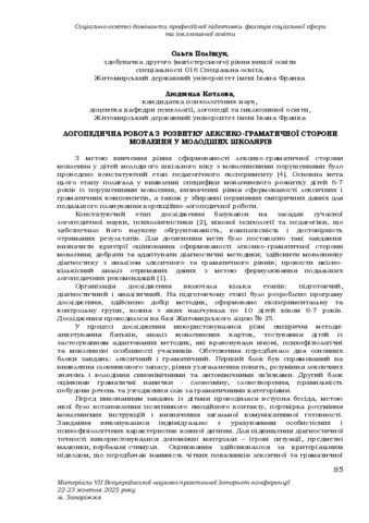 Поліщук О. Ю., Котлова Л. О.ORCID: https://orcid.org/0000-0003-2994-6724 (2025) Логопедична робота з розвитку лексико-граматичної сторони мовлення у молодших школярів. In: VІІ Всеукраїнська науково-практична Інтернет-конференція «Соціально-освітні домінанти професійної підготовки фахівців соціальної сфери та інклюзивної освіти», 22–23 жовтня 2025 р., Запоріжжя. С. 85–88.