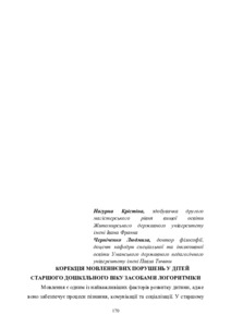 Нагурна К. Д., Черніченко Л. А.ORCID: https://orcid.org/0000-0001-8455-8869 (2025) Корекція мовленнєвих порушень у дітей старшого дошкільного віку засобами логоритміки. Вісник Освітньо-наукового центру сімейно-центрованих практик. № 4. С. 170–172.