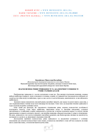 Баранівська М. В. (2025) Взаємозв’язок рівня тривожності та академічної успішності учнів старших класів. Соціально-гуманітарний вісник. № 62. С. 43–46. ISSN 2305-9869. DOI: 10.61718/sgv.