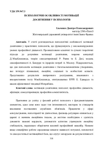 Ільченко Д. О. (2025) Психологічні особливості мотивації досягнення у психологів. In: IV Міжнародна науково-практична конференція «Science, technology and global challenges», 4–6 грудня 2025 р., Токіо, Японія. С. 518–522.