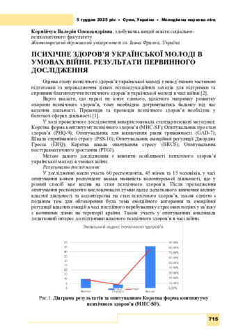Корнійчук В. О. (2025) Психічне здоров’я української молоді в умовах війни. Результати первинного дослідження. In: IX Міжнародна студентська наукова конференція «Пріоритетні напрямки та вектори розвитку світової науки», 5 грудня 2025 р., Суми. С. 715–718. DOI: 10.62732/liga-inter-05.12.2025.