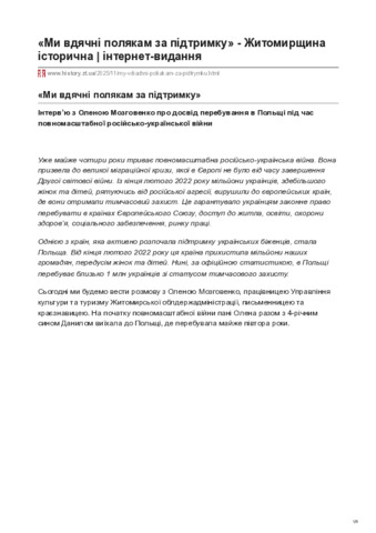 | ДСТУ 8302:2015: | Стельникович С. В. «Ми вдячні полякам за підтримку». Інтерв’ю з Оленою Мозговенко про досвід перебування в Польщі під час повномасштабної російсько-української війни. Житомирщина історична. Інтернет-видання. 2025. С. 1–9. |
