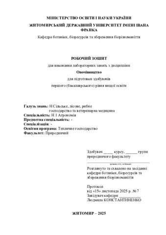 Робочий зошит для виконання лабораторних занять з дисципліни «Овочівництво»